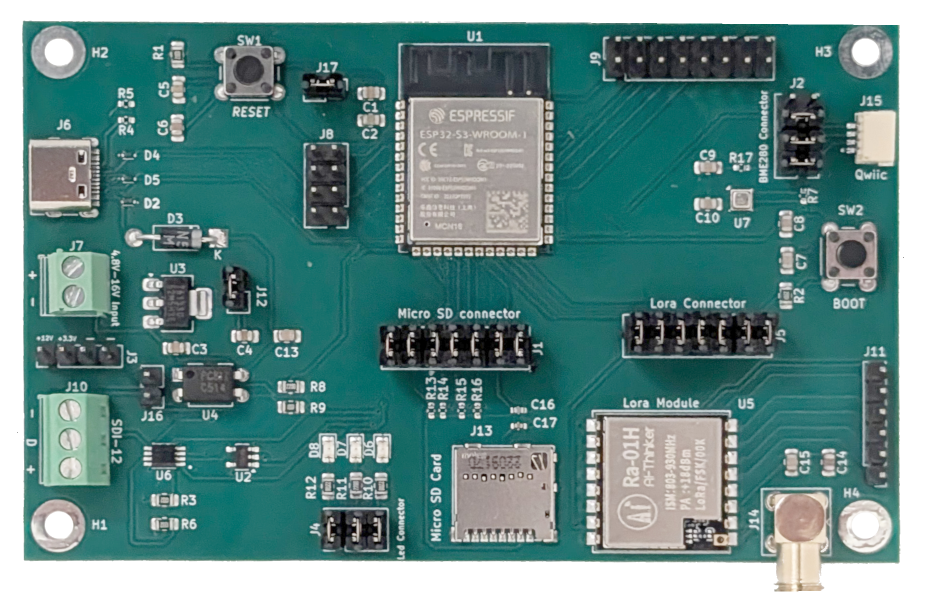 • ein LoRa-Modul mit einem SMA Antennenanschluss zur energieeffizienten Kommunikation über große Distanzen,